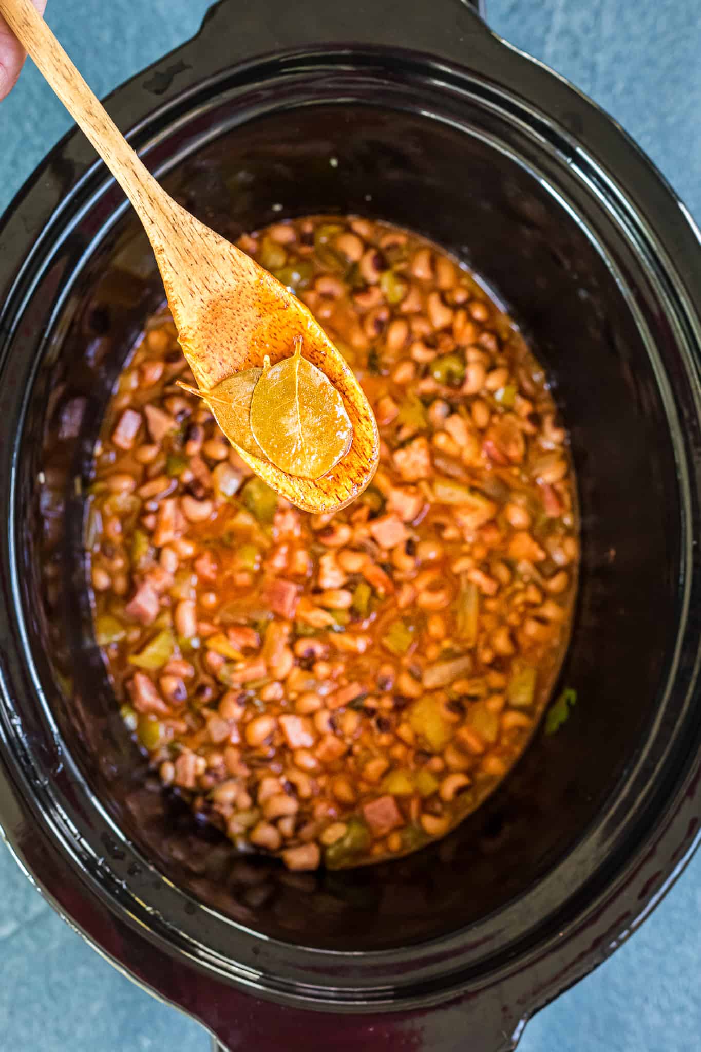 After 2-3 hours of cook time, open the lid. Remove the bay leaves. Season the black-eyed peas with salt and pepper to taste. It’s best to add salt to slow-cooked food at the end. It tends to cook out if you salt it before cooking.
