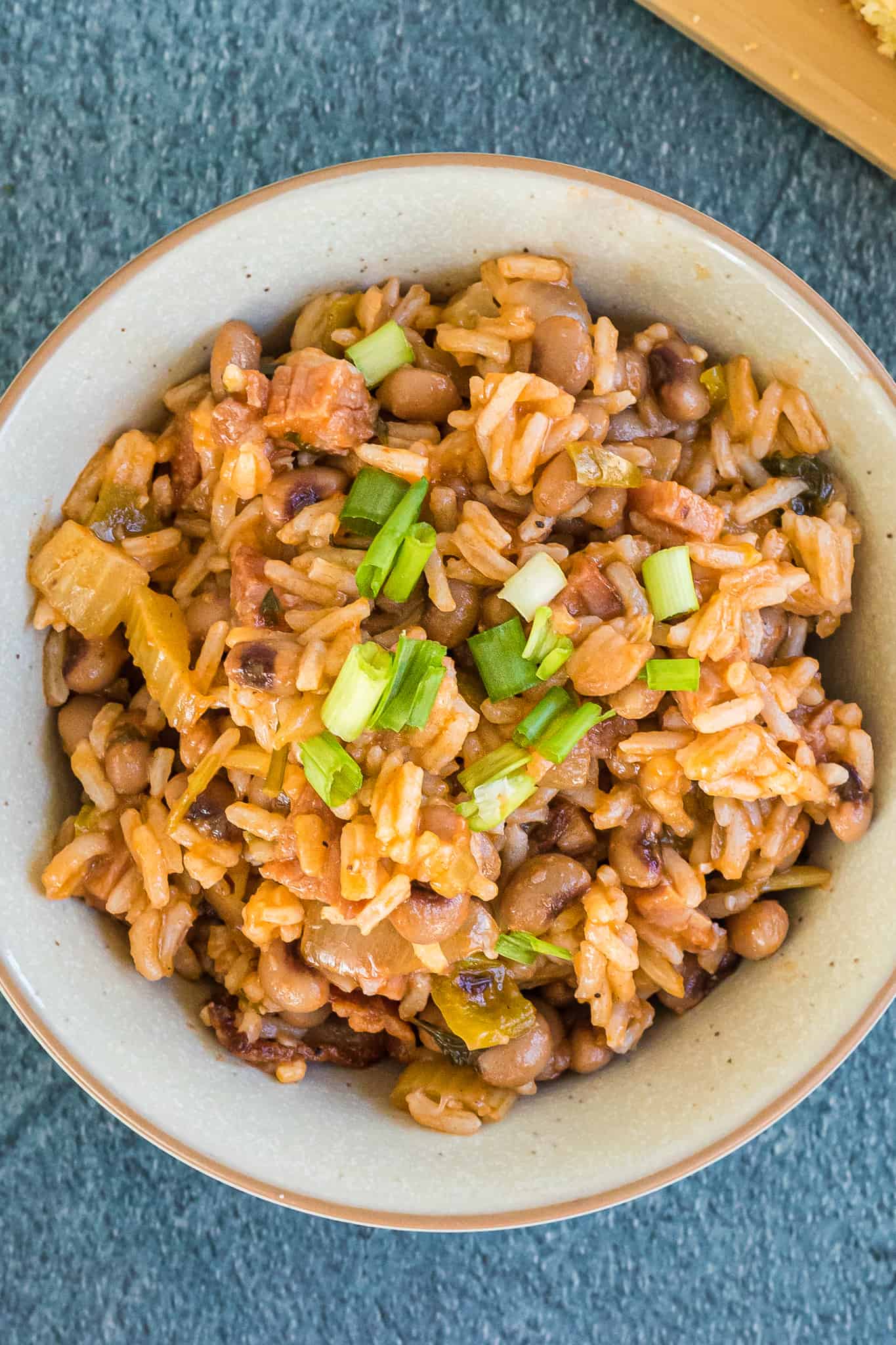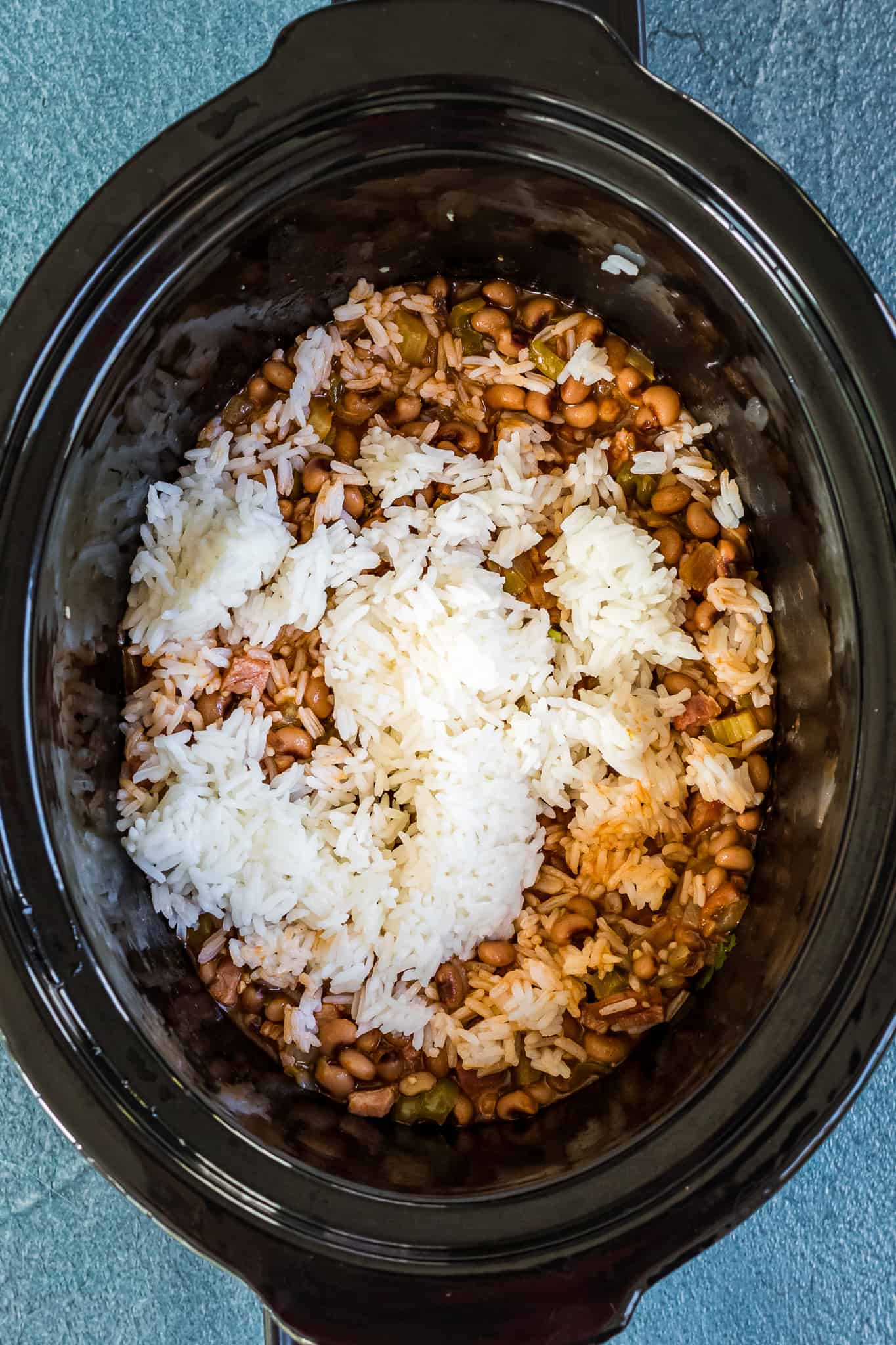 Make slow cooker black-eyed peas using canned beans, ham and rice in honor of the Southern tradition of eating black-eyed peas for luck.