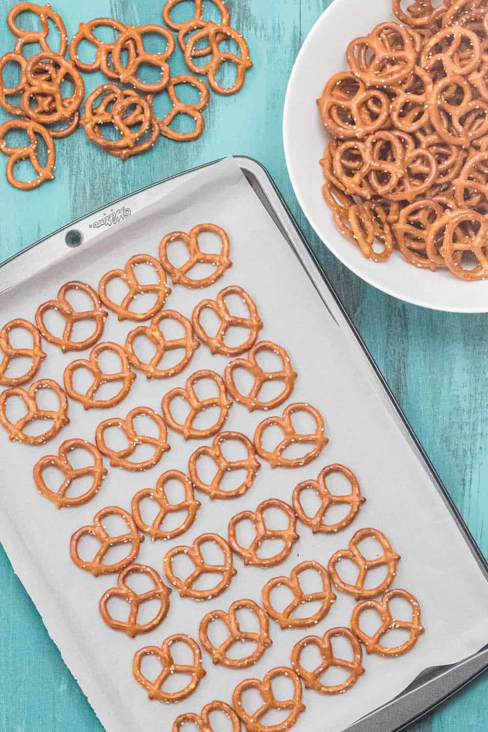 - Line a sheet pan with parchment paper and arrange pretzels in a single layer.
