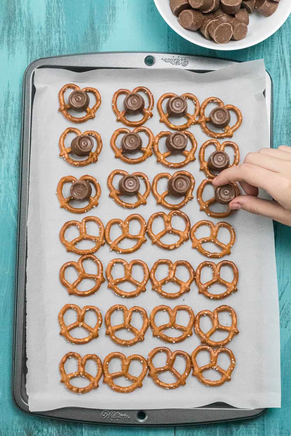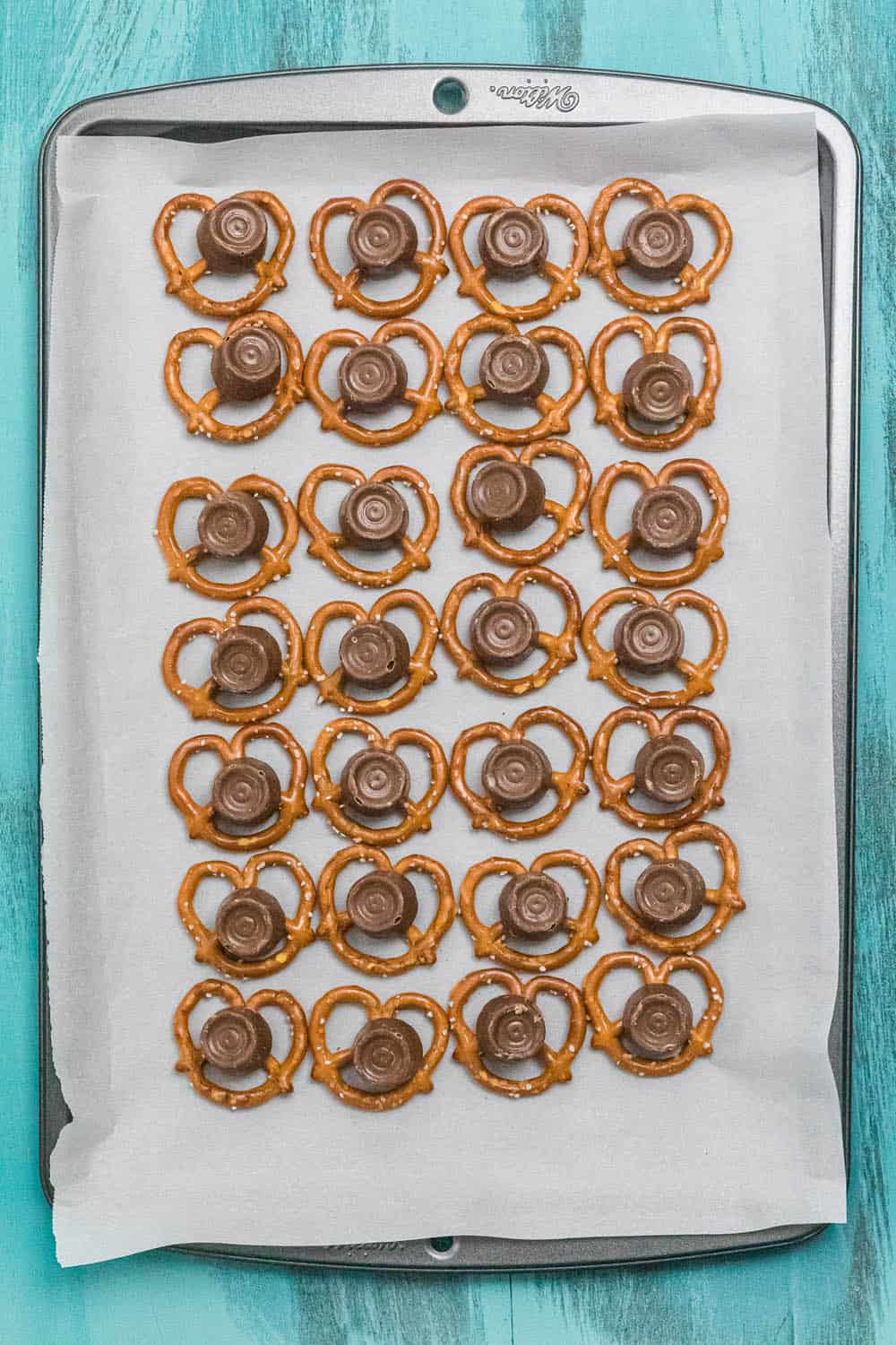 - Put one chocolate covered caramel candy on top of each pretzel.