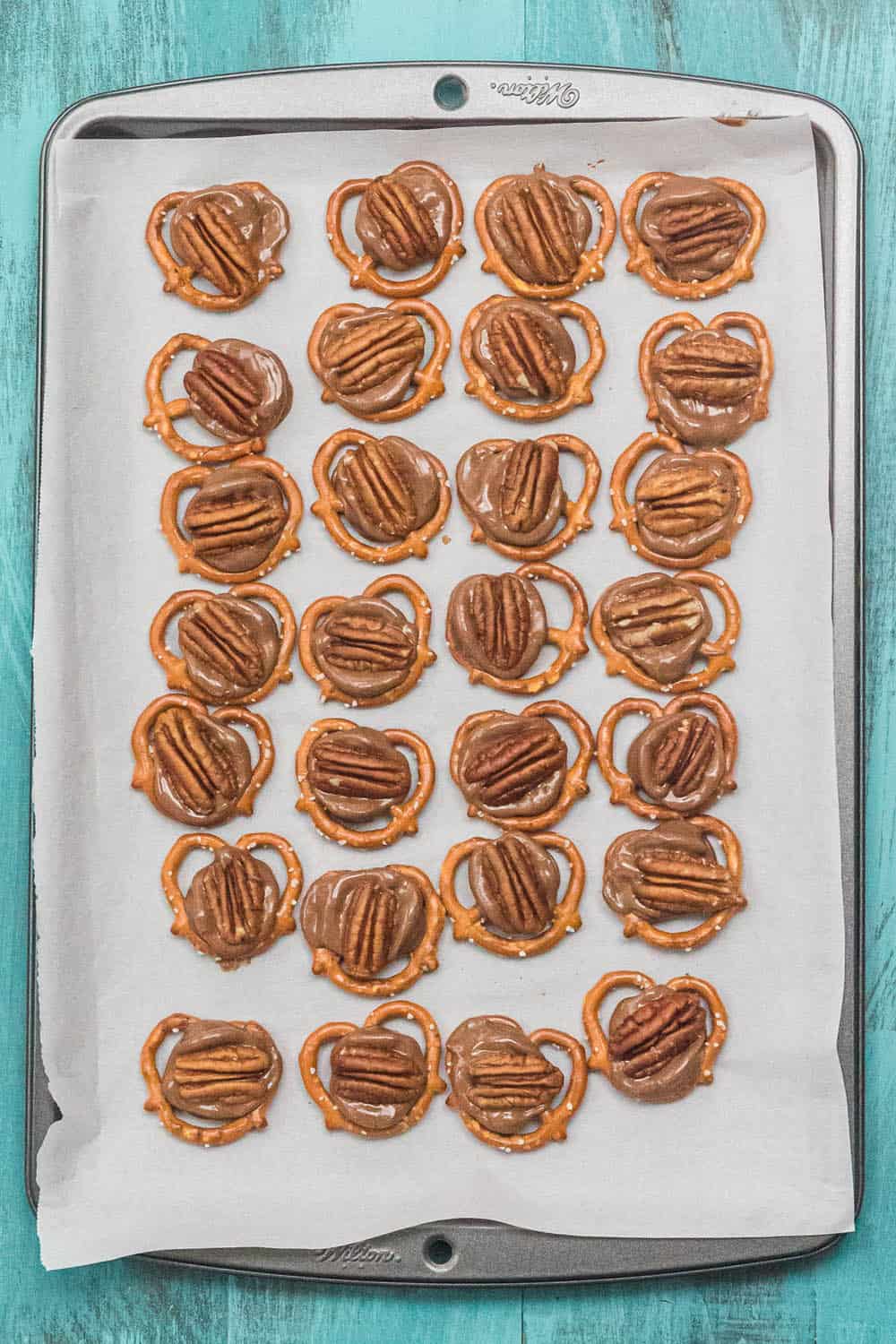 Remove pretzels from the oven. Immediately press one pecan onto the top of each candy.