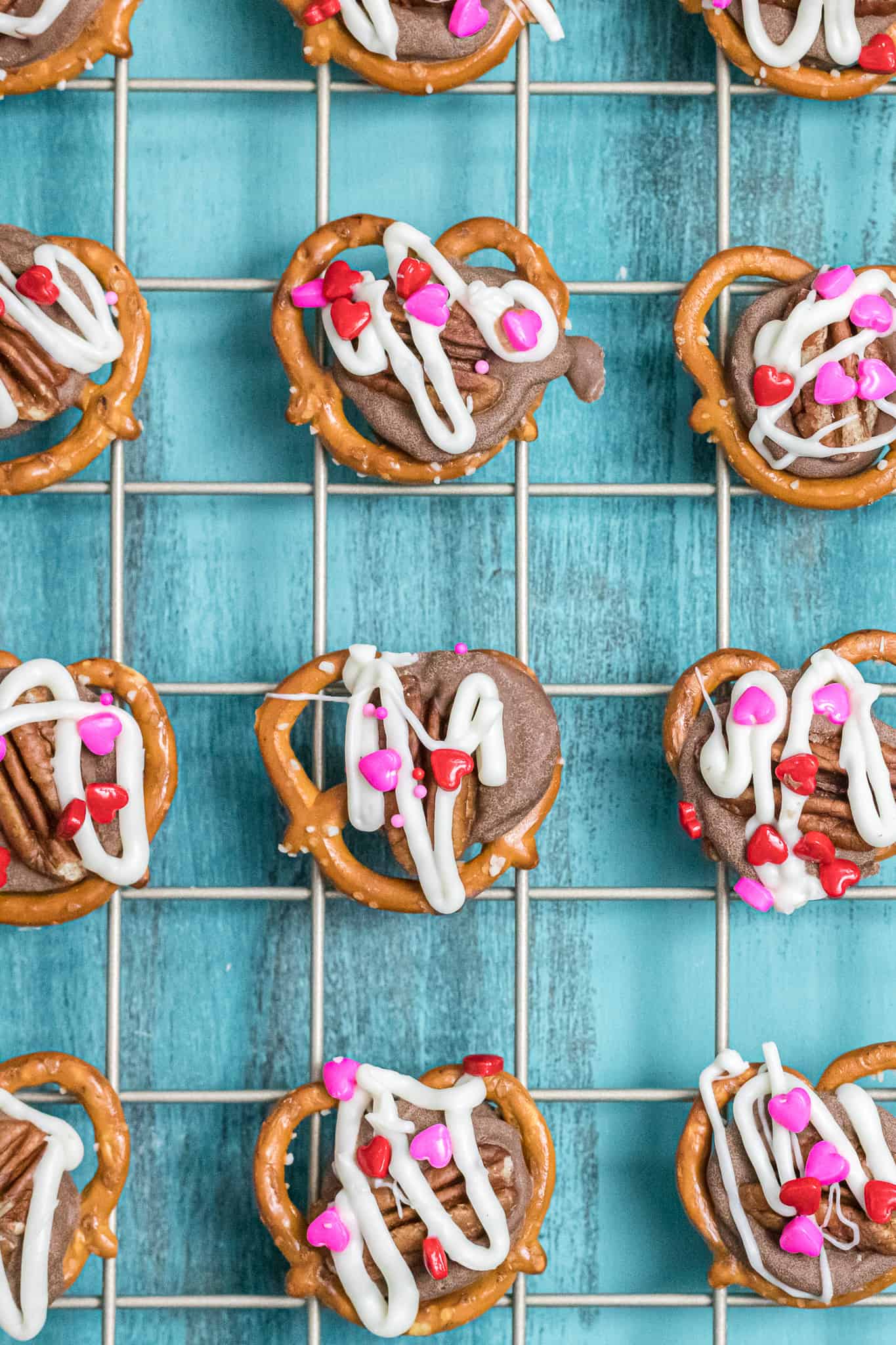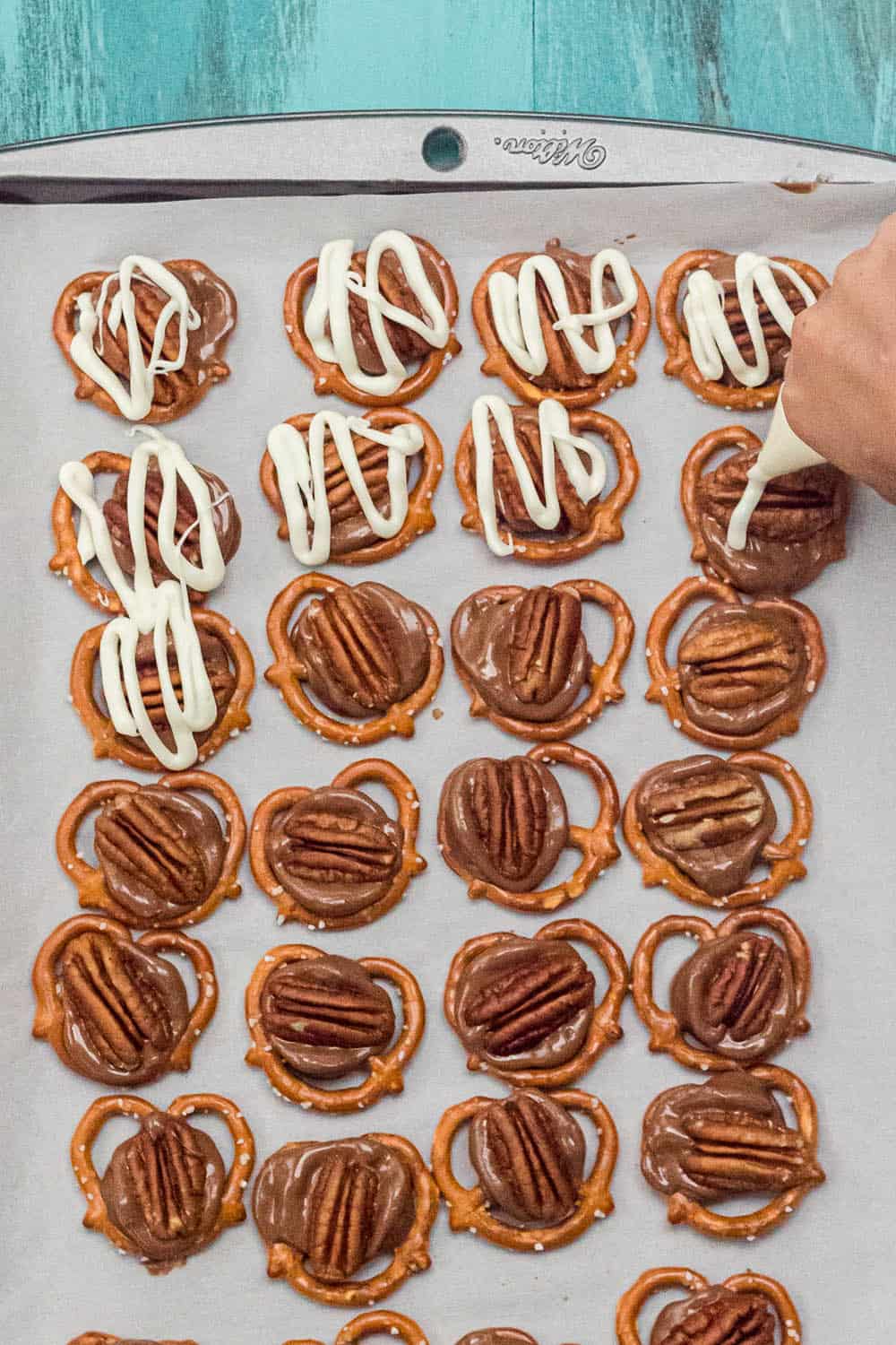 - Remove pretzels from oven and press one pecan onto the top of each candy and drizzle melted white chocolate over the top.