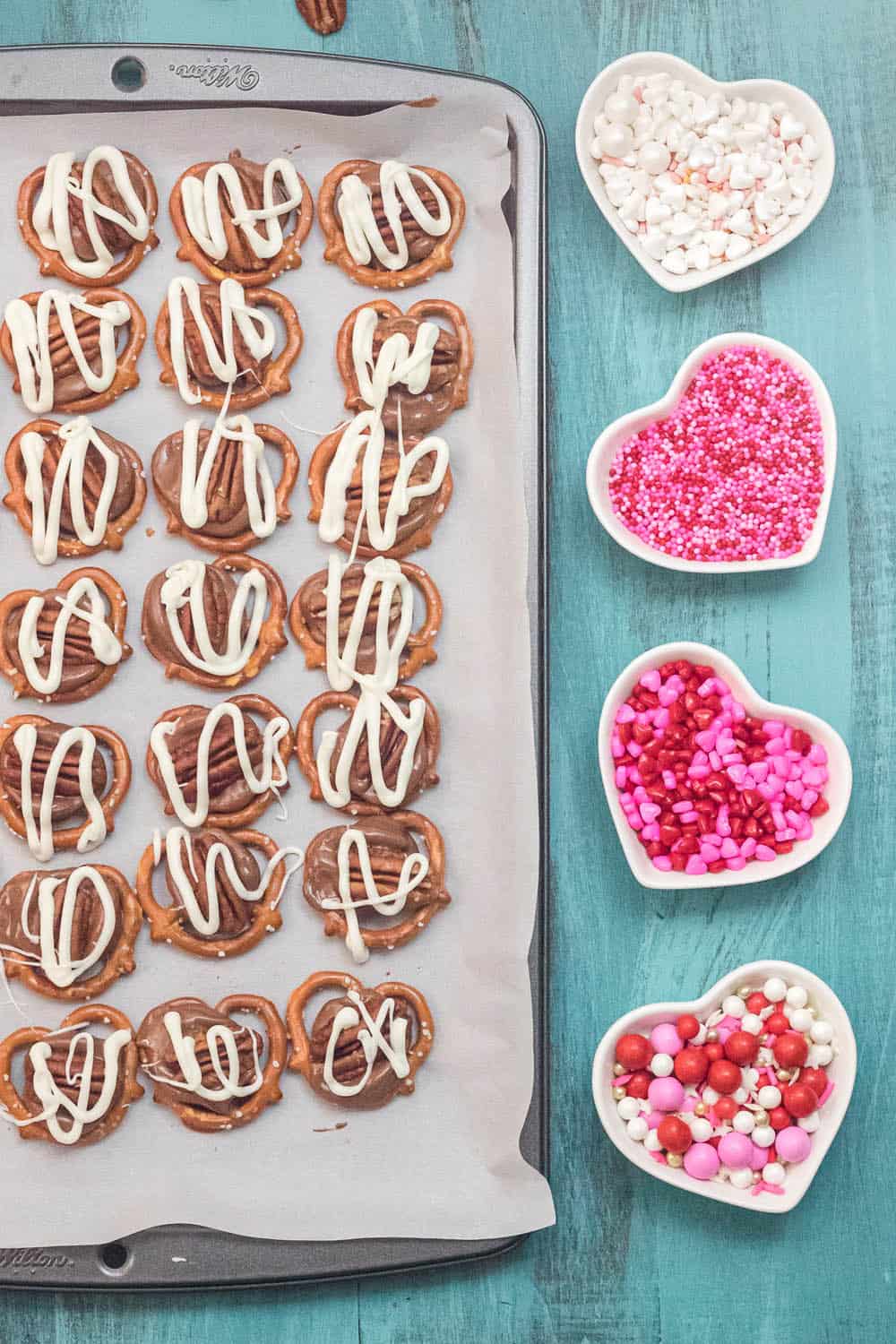 - Sprinkle Valentine’s candy and/or sprinkles on top quickly before the chocolate cools.