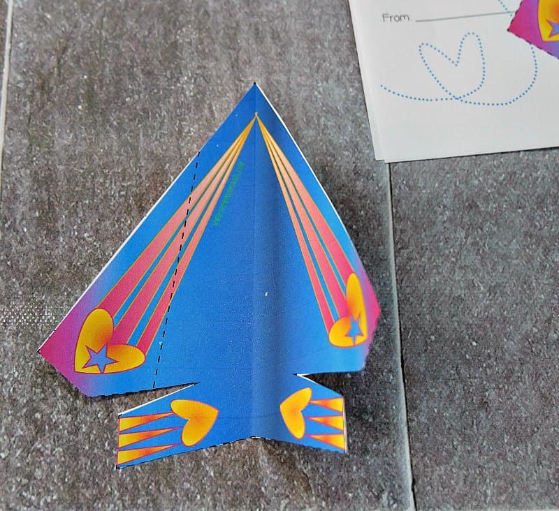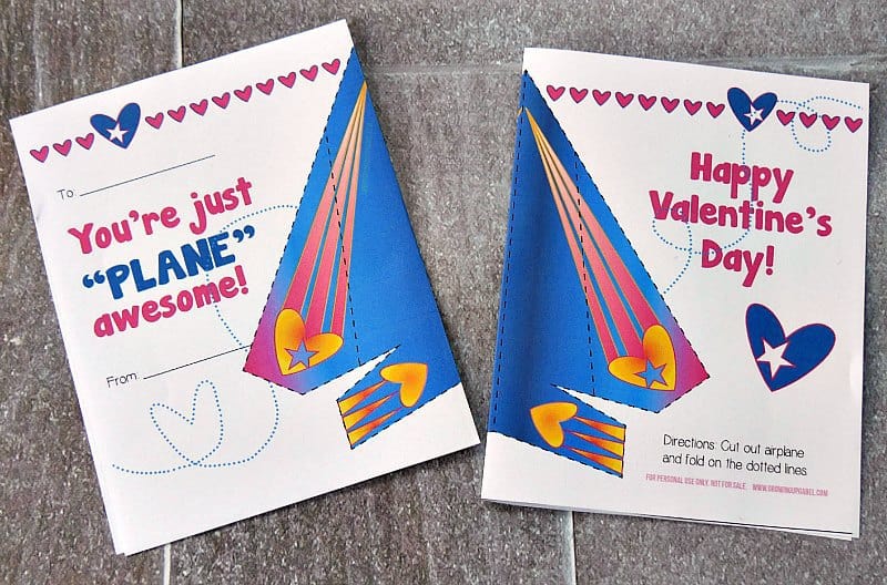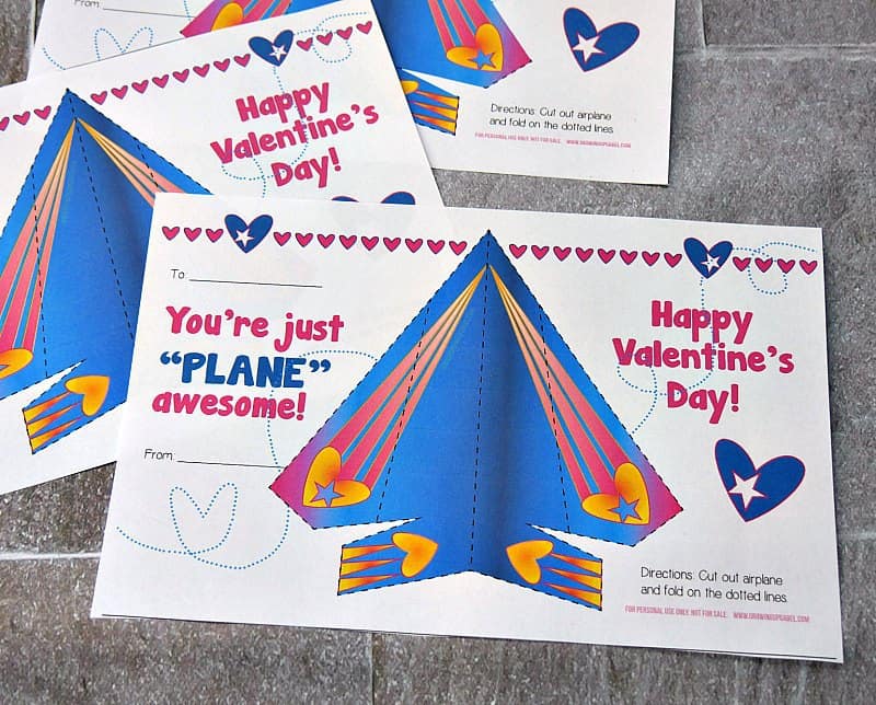 We took that idea and created these adorable Valentine’s cards for kids. The cards are folded in half and given out. Then the recipient can cut out and fold the plane for a little Valentine’s day fun.