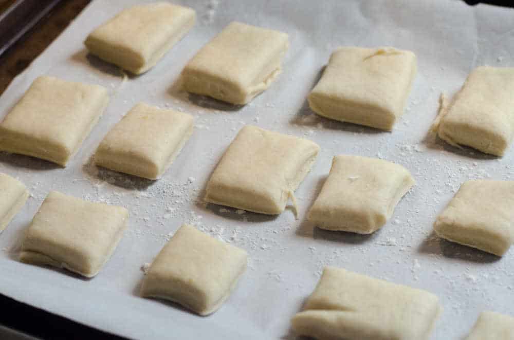 - Use a pizza cutter to cut the dough into rectangles about 3 inches by 5 inches big.