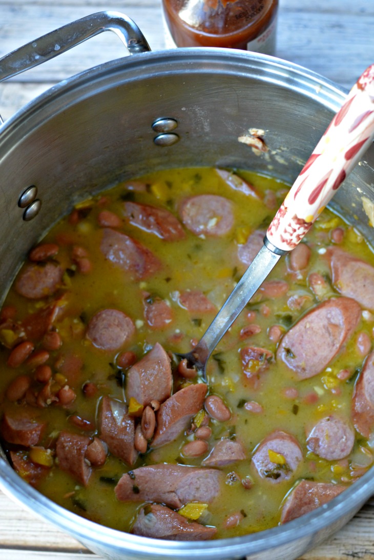 Add sausage and allow to brown, about 5 minutes. Add chicken broth, beans, Cajun seasonings, Bay leaves, basil, and hot pepper sauce.