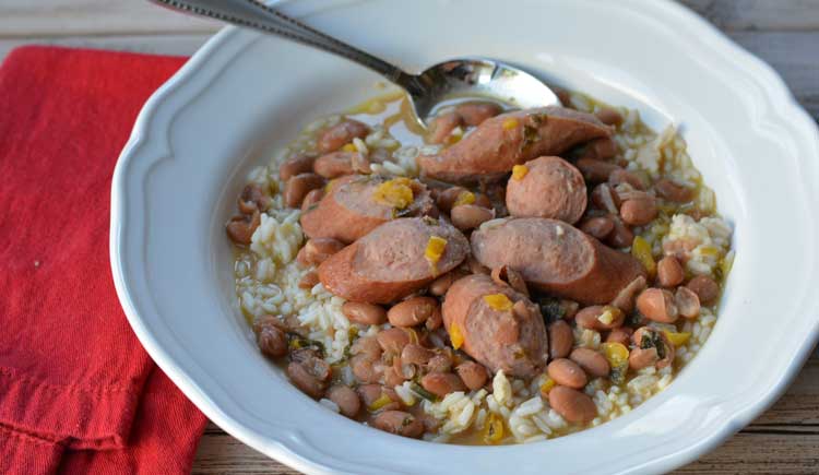 Cajun rice and beans is an easy one pot meal. A sauce of beans and Butterball Turkey Dinner Sausage is served over a bed of rice for a filling and delicious meal.