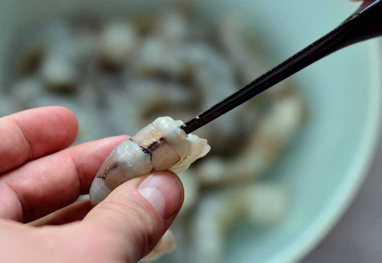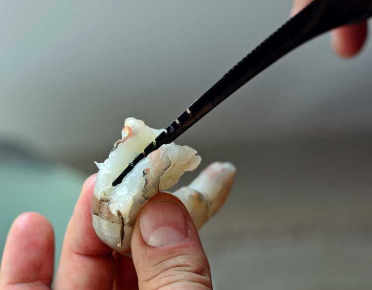 When using the tool, hold the shrimp legs down and straighten its back. Insert the Shrimp Cleaner (teeth up) in the small hole in the center of the exposed meat, and push it halfway into the shrimp.