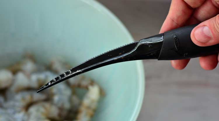 The OXO Good Grips Shrimp Cleaner takes the work out of peeling and deveining any size shrimp. Simply insert the ridged cleaner into the end of the shrimp to split the shell and remove the vein in one motion. Then, rinse the shrimp under cold water and prepare. A soft handle makes this shrimp cleaner comfortable to use, and non-slip even when wet.