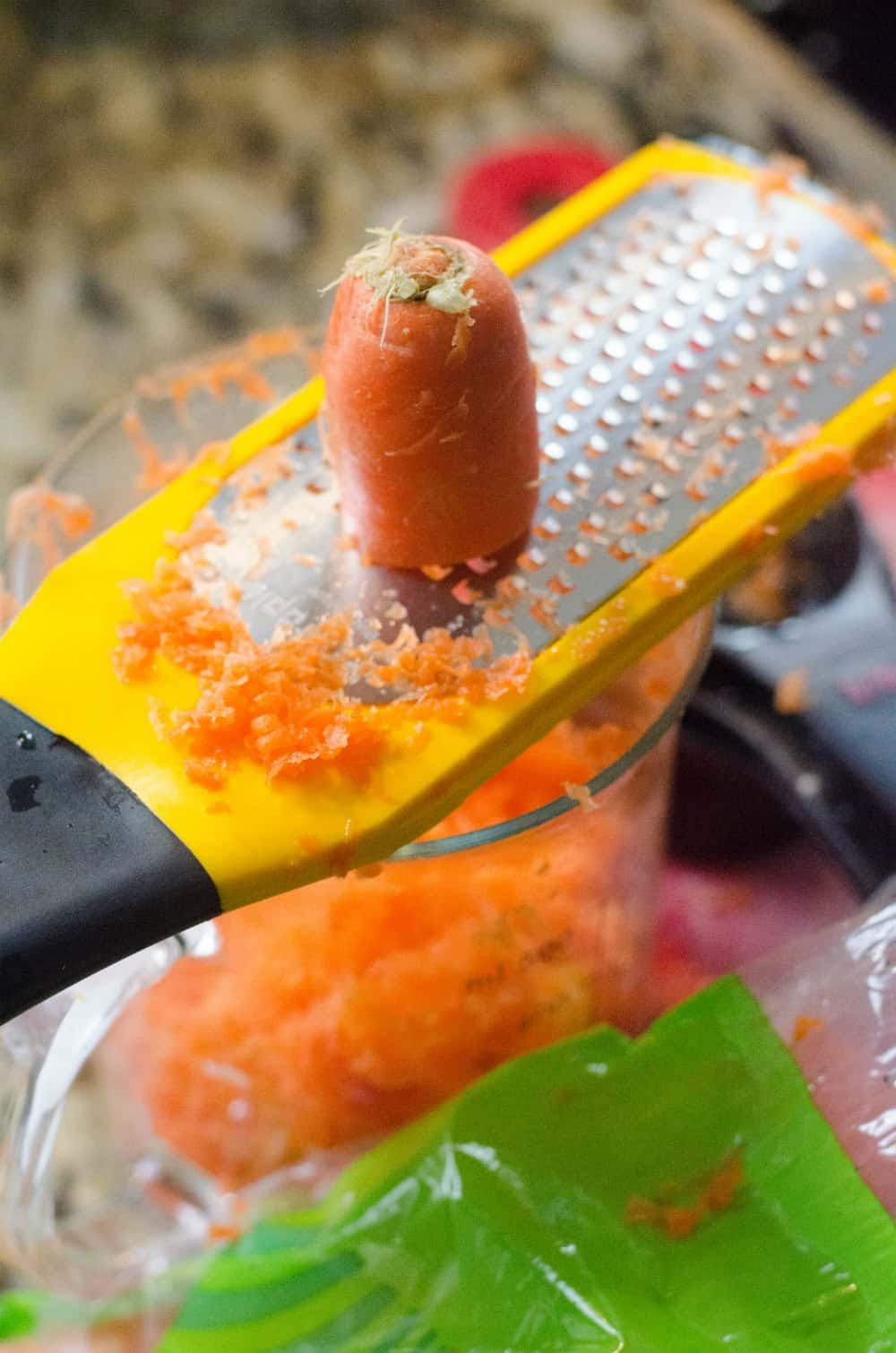 Finally, use a wooden spoon to stir in the grated carrots. There is no way around grating carrots for homemade carrot cake and after years of making carrot cake, the best way to grate them is by hand. A food processor just does not do the job well. I have no idea why, but hand grated carrots just work better.