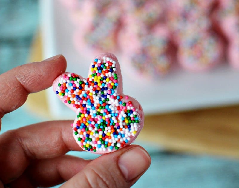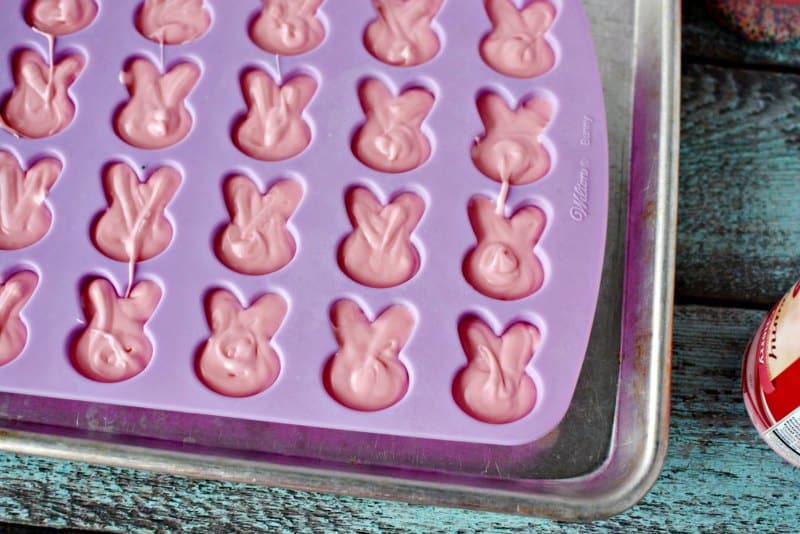 - Place your bunny pan onto a baking sheet. Fill each cavity with rainbow sprinkles OR add the sprinkles on top of your fudge.