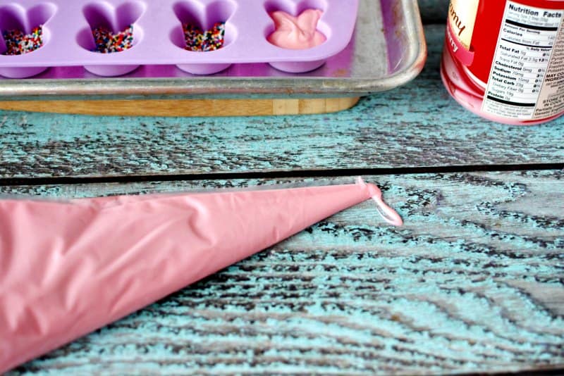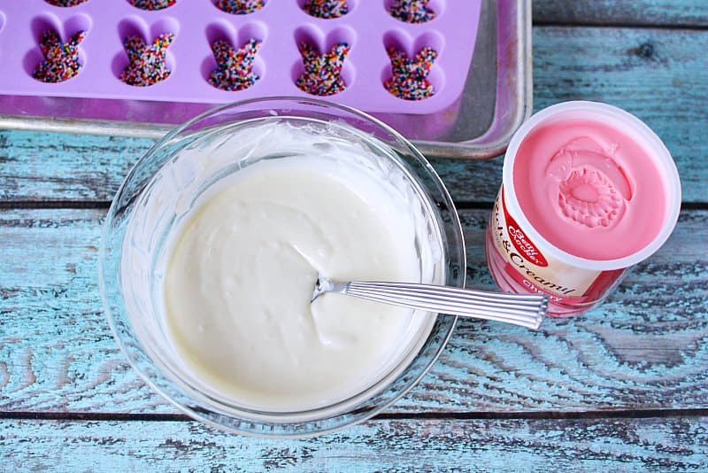 - In a microwave safe bowl (preferably one bigger than the one I use used) pour chocolate chips and microwave for 60 seconds. Stir and continue to microwave for 1 minute more, stirring every 15 seconds until smooth. Stir in frosting. The mixture will be thick. Mix well and return to the microwave and heat for an additional 15 seconds and stir well. Place into a piping bag and pipe into each bunny cavity.