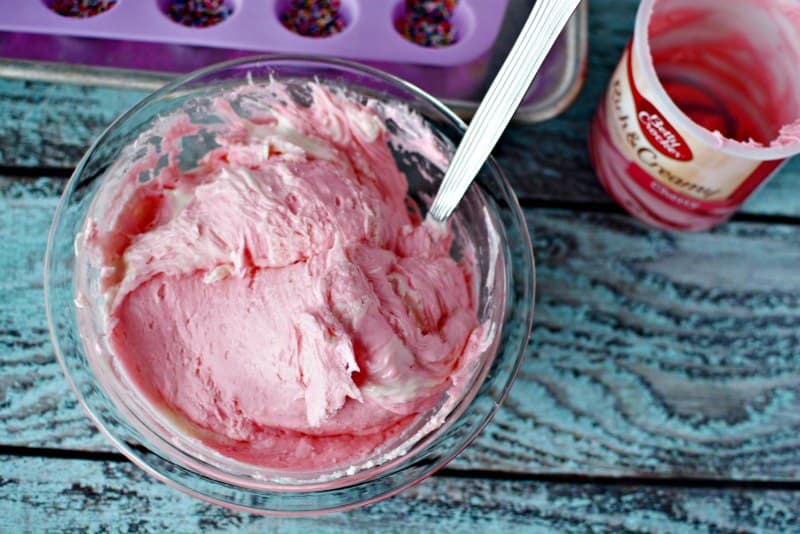 I’ve seen a 2 ingredient strawberry fudge recipe that uses strawberry frosting to make fudge. It intrigues me! But it seems everyone else had the same idea because strawberry frosting that wasn’t whipped or fluffy was not around. And since most recipes I looked at said NOT to use whipped or fluffy frosting, we went with cherry instead.