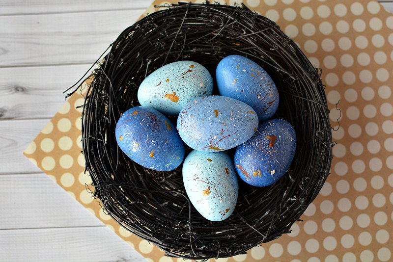 Let set to dry completely. Once the eggs are dry, arrange them in a bird’s nest or another container to display. I painted my nest with Rust-Oleum’s oil-rubbed bronze spray paint to make it darker so the eggs would stand out more.