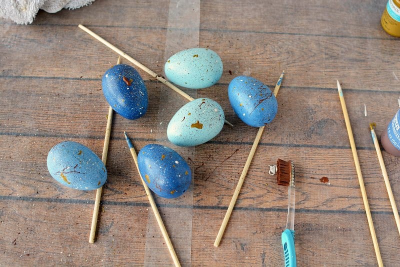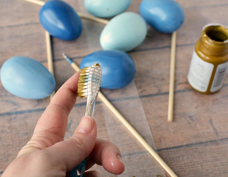 Place a small amount of gold paint onto the toothbrush and run your finger along it to make it spatter. Repeat until all eggs are covered. Clean your toothbrush and add white paint to it and splatter your eggs. And finally, repeat the process with the brown paint.