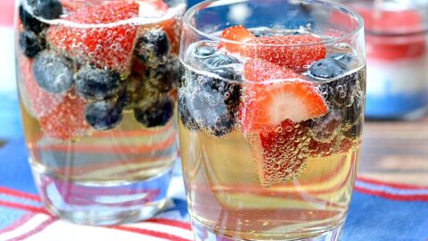 Celebrate summer with this easy white wine sangria recipe in red, white and blue! A two ingredient cocktail and fruit combine for a quick summer cocktail.