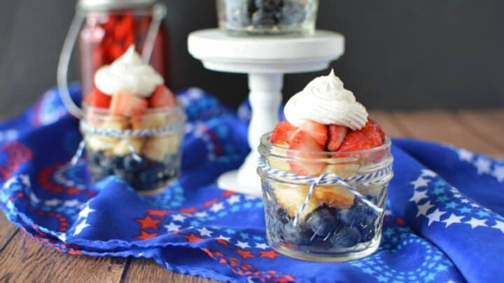 Easy and festive, red, white, and blue mixed berry shortcake in jars are a fun Fourth of July treat. Layer berries and cake in jars for individual desserts.