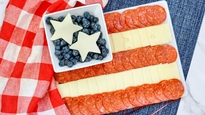 Make a patriotic charcuterie board that looks like an American flag with only 3 ingredients for easy snacking on the 4th of July.