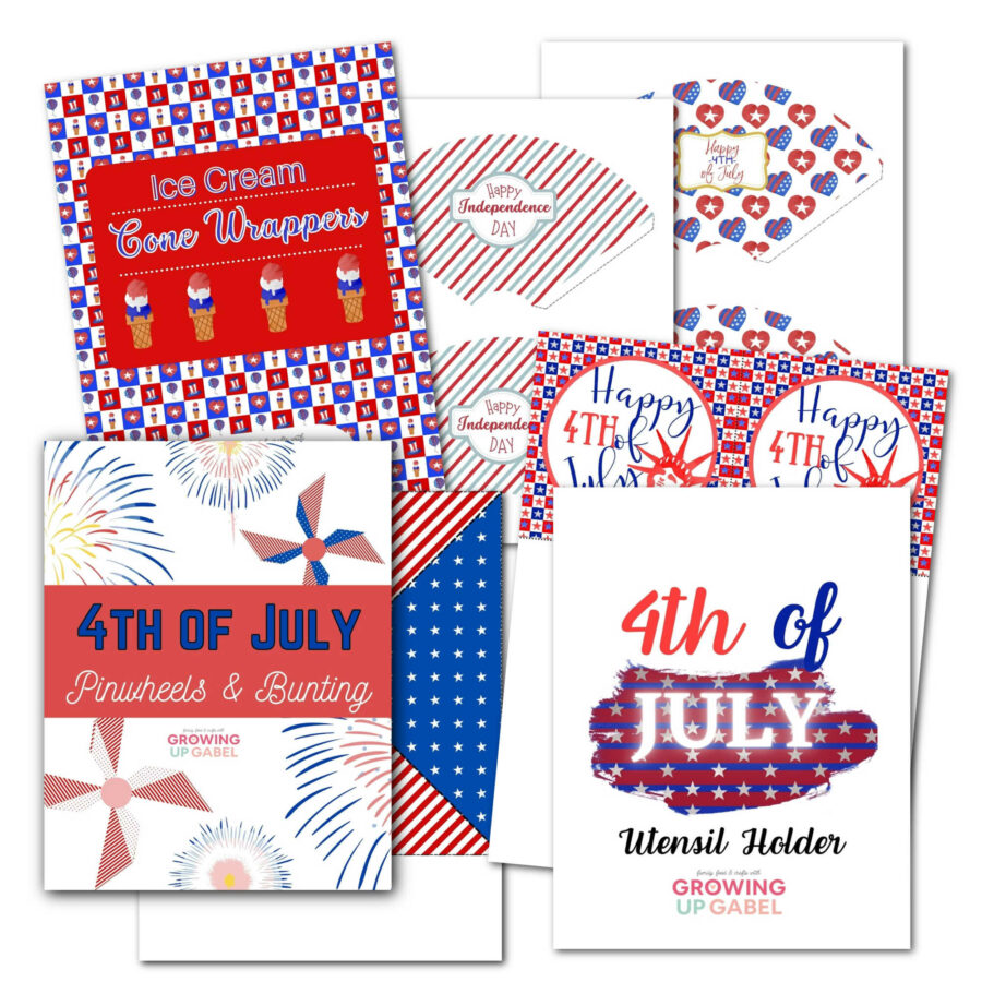 Printable 4th of July party decorations include bunting, pinwheels, ice cream cone wrappers, and utensil holders to make your party more festive.