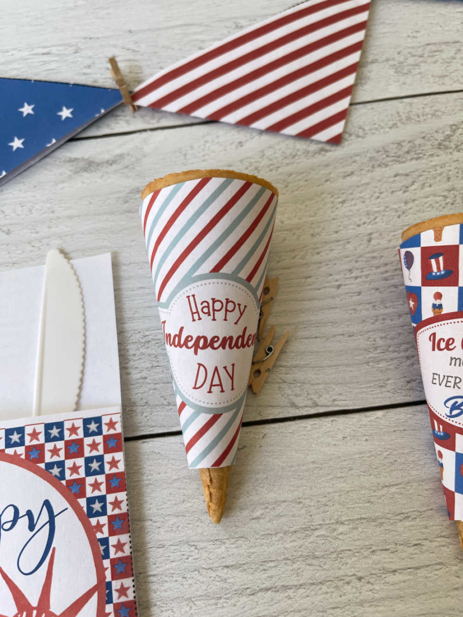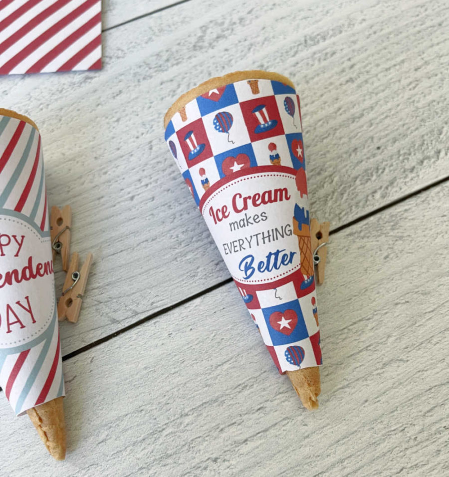 Mix up a batch of Red, White, and Blue Homemade Ice Cream to serve in ice cream cones wrapped in patriotic wrappers. The wrappers come in 3 designs with two wrappers per page when printed. Just cut them out and wrap them around the cones. These are also big enough that they would work with waffle cones.