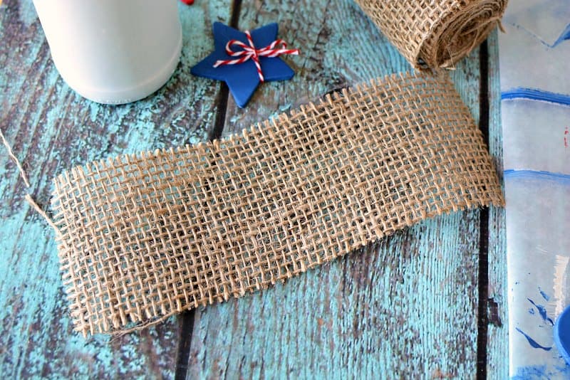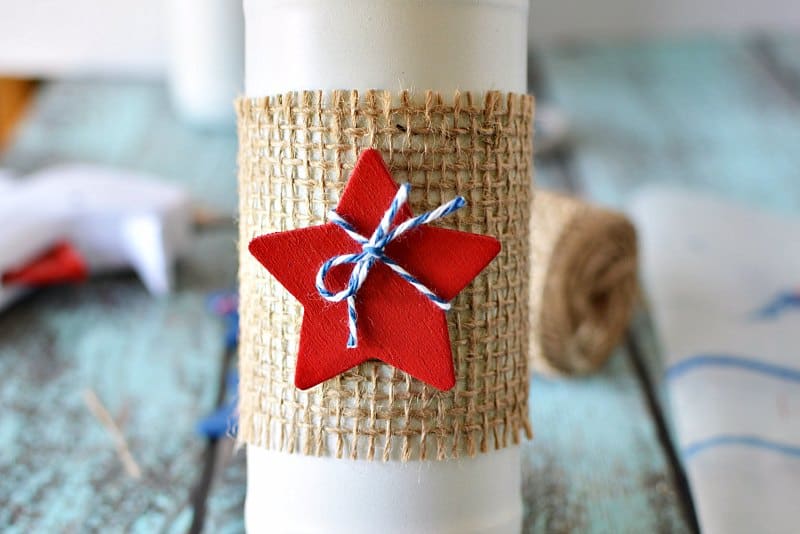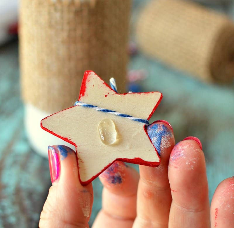 While the bottles are drying, paint 2 wooden stars blue and 1 wooden star red with the acrylic paint. You will probably need two coats. Let dry completely. Add baker’s twine to each painted wood star. Tie a small bow. Trim ends.