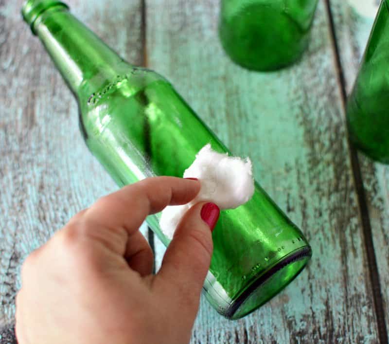 Once the labels are off, wash and dry the bottles. Then use a cotton ball to wipe rubbing alcohol all over the bottles.