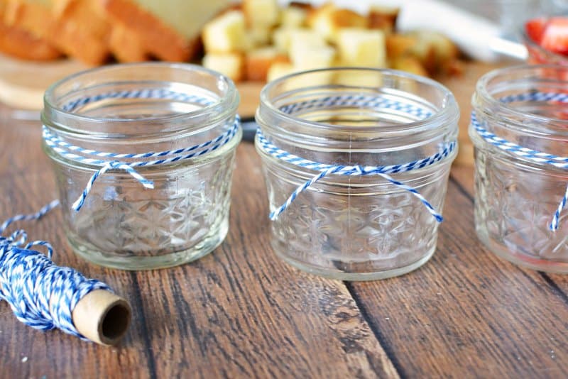 Choose jars or another container for the shortcakes. We used small, 4 oz glass canning jars. For decoration, wrap baker’s twine around the jars .