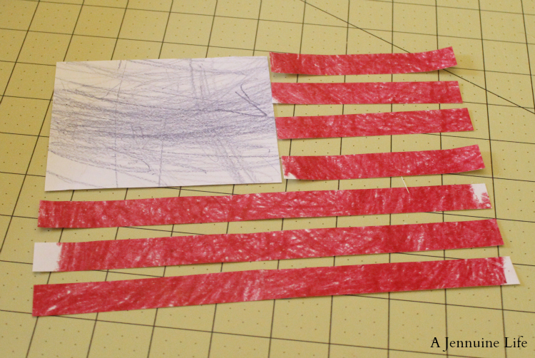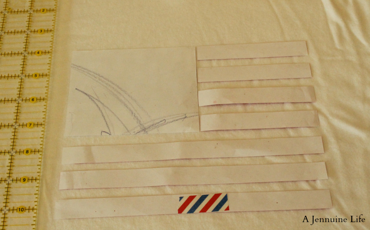 Cut the red paper into 7 strips. We made 3 long strips and 4 short strips. You can adjust for bigger or smaller shirts. You don’t need to be too precise on the size of the strips. Make them fit your shirt sizes. Our were just over 1/4″ wide and 8.5″ long for the three full-length strips. The shorter strips at the top were 4″ long for the four strips next to the blue field.