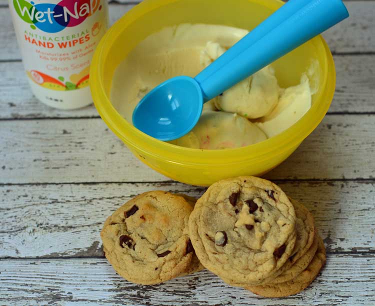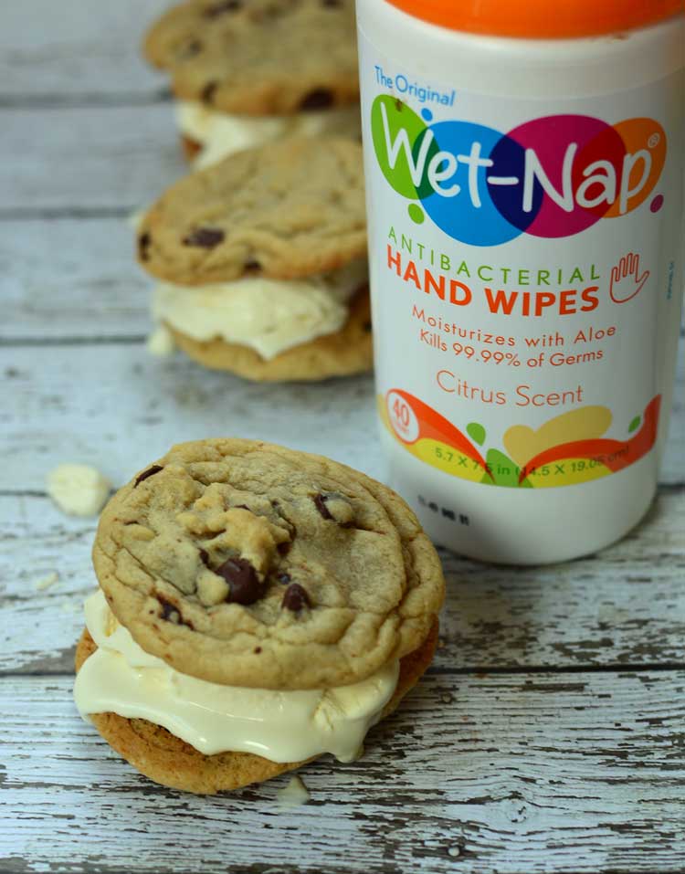 The one down side to making ice cream sandwiches with homemade ice cream is that it seems to melt very quickly. So before you start, get out the Wet-Nap wipes to have handy to wipe down sticky hands and faces. I really missed having wipes on hand after we stopped carrying a diaper bag so now I have a tub of Wet-Nap wipes in my car at all times. You can even print a $.55 off coupon for any Wet-Nap product and pick some up at Walmart.