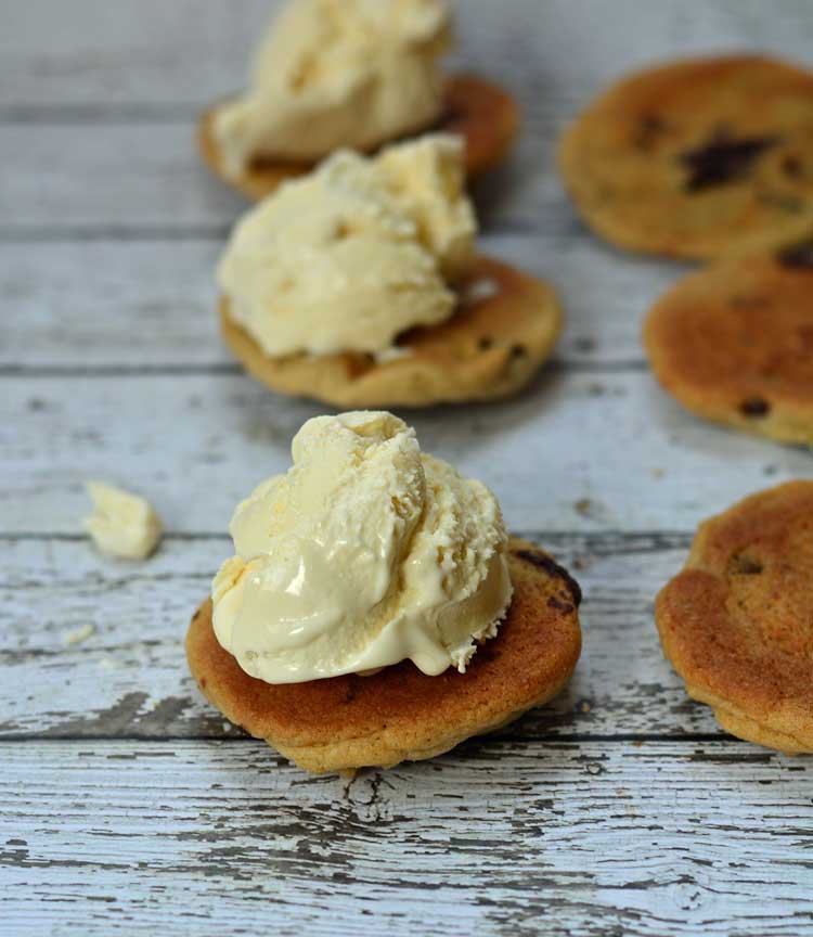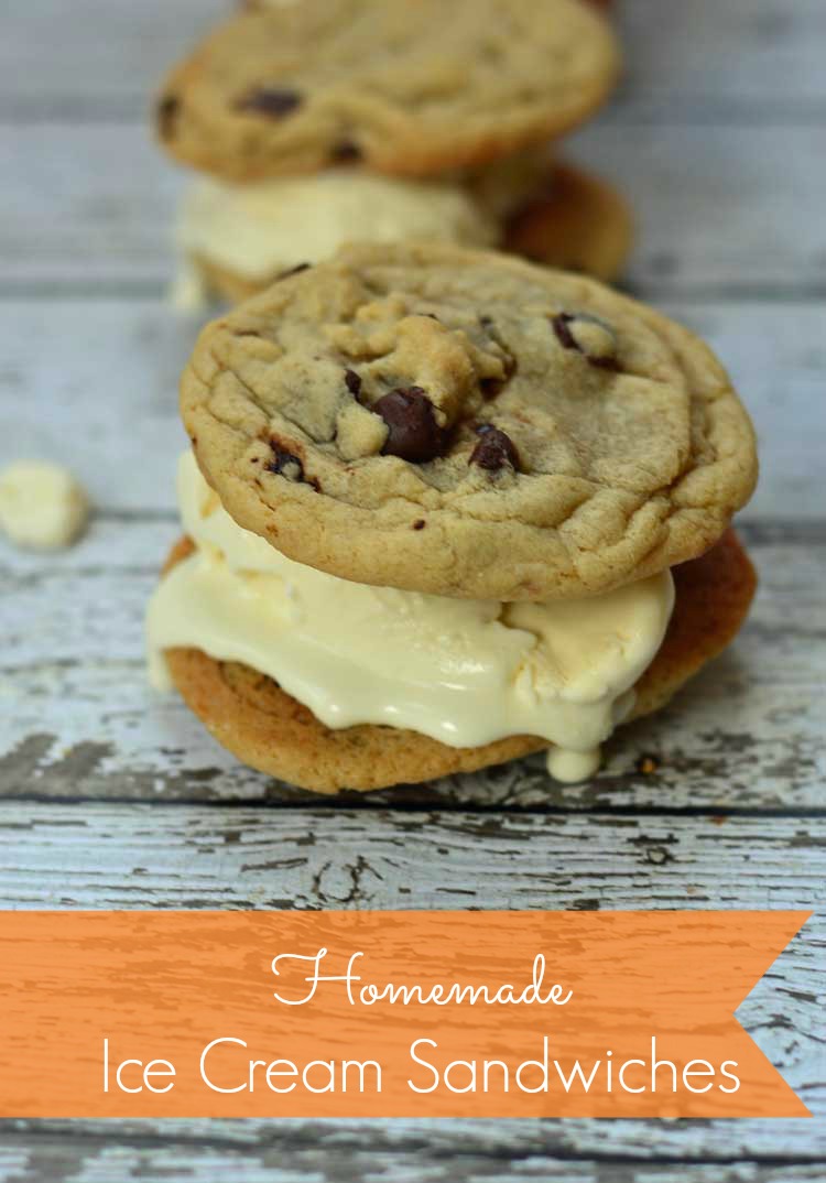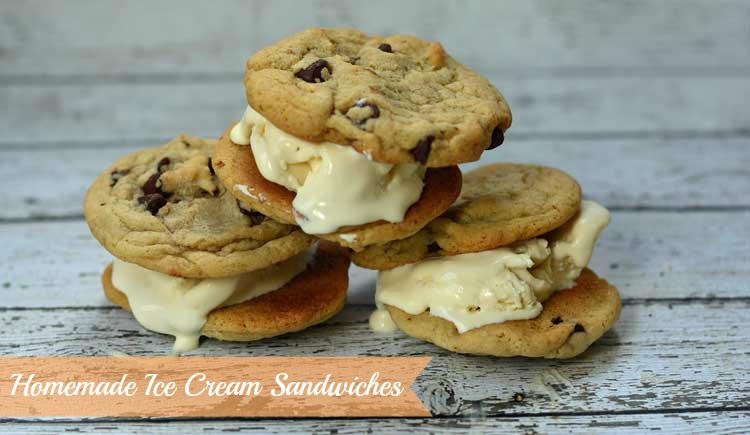 As the weather gets warmer, my kids thoughts turn to staying up later, going to the pool, and eating lots of ice cream. I really enjoy making homemade ice cream during the summer like 3 Ingredient Ice Cream, Chocolate Gelato, and Pumpkin Ice Cream. But after about mid-June, we all get a little bored of just plain ice cream. One of our favorite treats is to take homemade chocolate chip cookies and pair them with ice cream for homemade ice cream sandwiches.