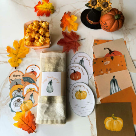 The invitations are on a sheet with four unique pumpkin designs. These aren’t just invitations. They’re the first glimpse your guests will get of the lovingly planned gathering you’re hosting. Each vintage pumpkin design resonates with the warmth and joy of the season. The invitations will add a personal touch that your guests will appreciate, setting the tone for your dinner.