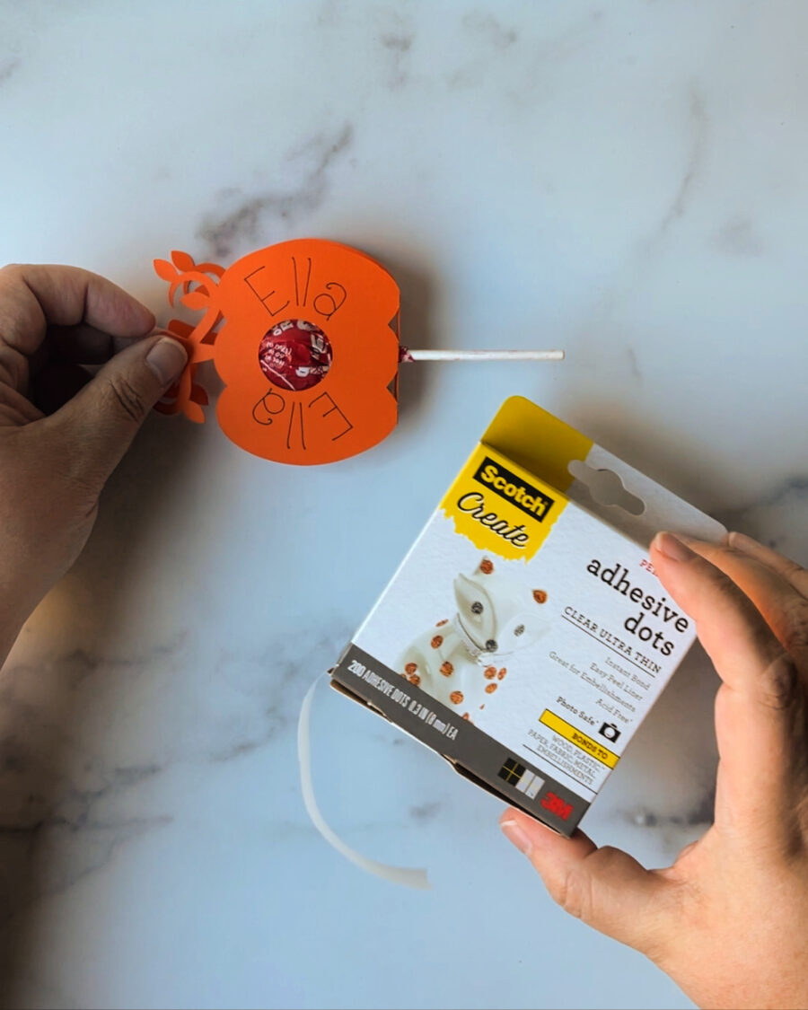 Use tape, glue, or adhesive dots on the top stem to keep the pumpkin closed around the lollipop. You only need adhesive on the stem. This also helps the lollipop fit best.