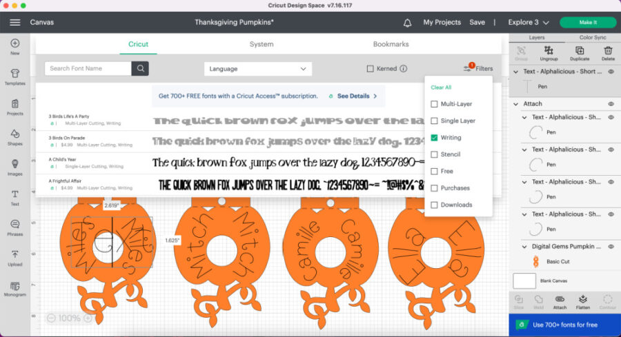 You want to ensure that your font is written and not cut out of the pumpkin. Pick a font you want to use that is writable and ensure the “Operation” is set to “Pen.” You can search under the filters in the fonts and choose “writing” to easily find fonts that write well. We used the font “Alphalicious – Short Stack,” which is available for purchase or with a Cricut Access Membership. When choosing a font, uncheck the box at the top that says “kerned” to see more options.