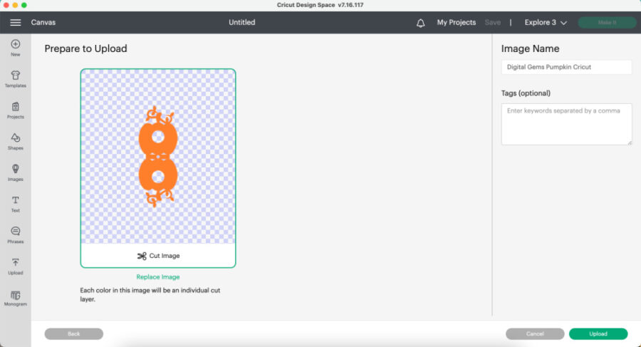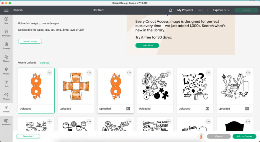 Open Cricut’s Design Space on your computer and open a new canvas. On the bottom left of the screen, click “Upload.”