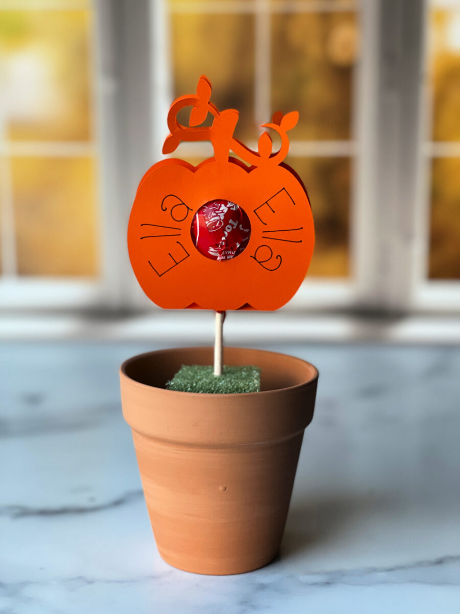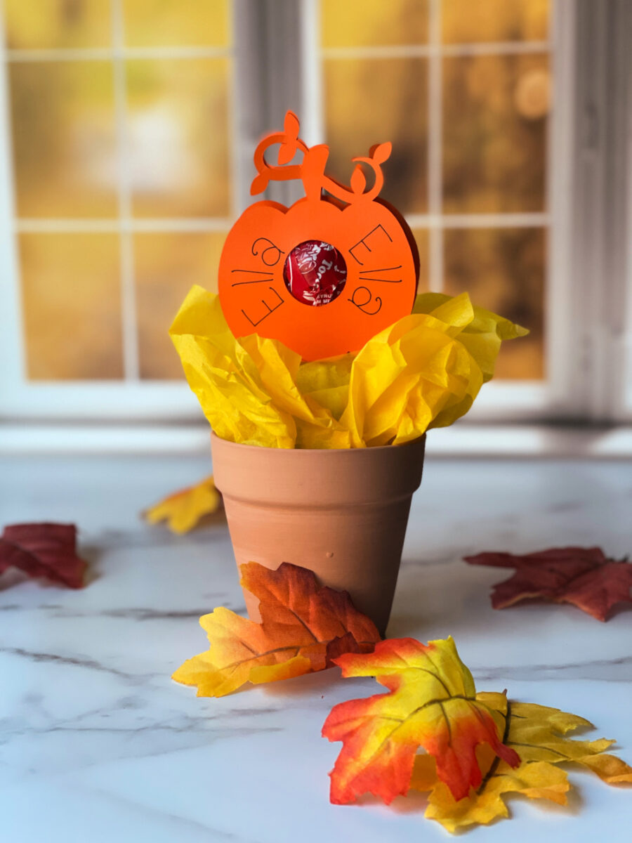 Make your Thanksgiving table fun with Pumpkin Thanksgiving place cards. Pumpkin place cards are easy to make with lightweight card stock, Tootsie pops, and dollar store terra cotta planters. Cut out the pumpkin on a Cricut cutting machine. Let the machine also write the names on the cards. Super easy! Pumpkin lollipop place cards are fun for both the kid’s table and the adults.