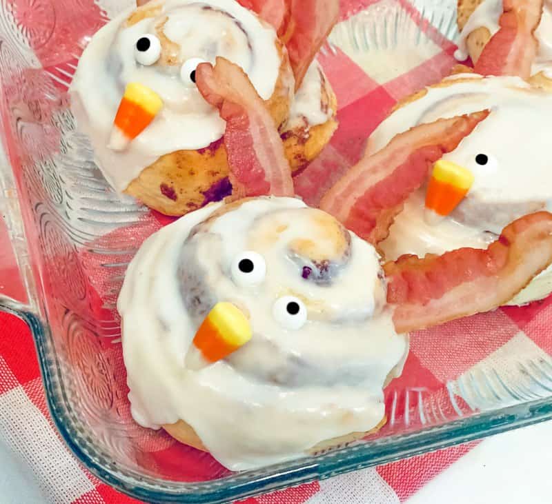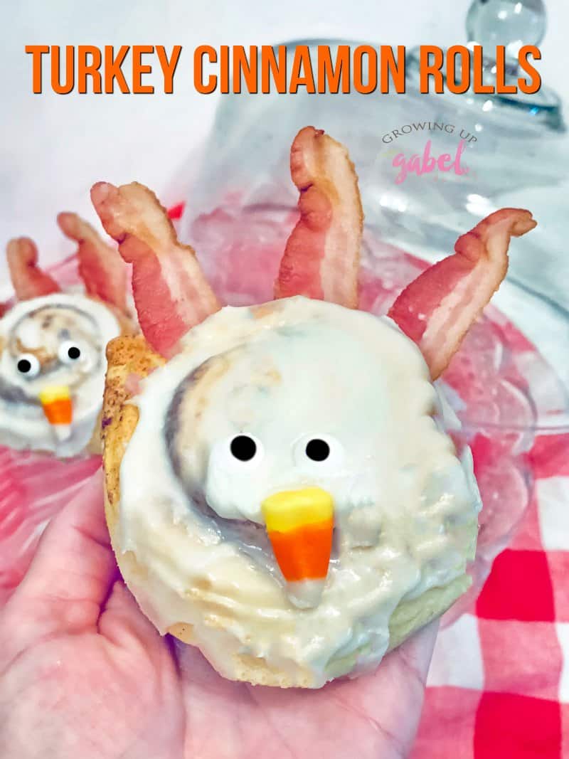 Make Thanksgiving morning fun by serving turkey cinnamon rolls! Super quick and easy to make with canned cinnamon rolls, candy, and pre-cooked bacon.
