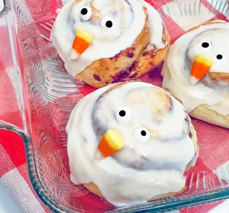 - Once the cinnamon rolls are frosted, take your candy eyes and stick two on each cinnamon roll. The icing will act as a glue. Take a candy corn and place it under the candy eyes.