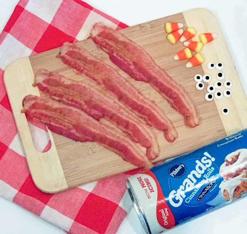 Candy corn and candy eyes will give the turkey his face. And the feathers are made from packaged pre-cooked bacon. Now, pre-cooked bacon is not normally a staple. But don’t skip it here! These are the trick to making great looking turkeys because the bacon stands up straight so the feathers aren’t limp. You could also try to cook your own bacon but we found the pre-cooked to be perfect.