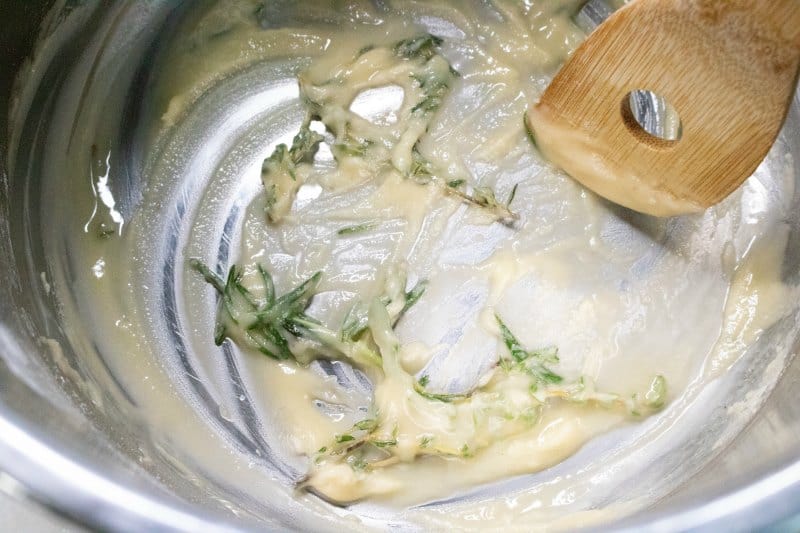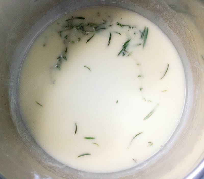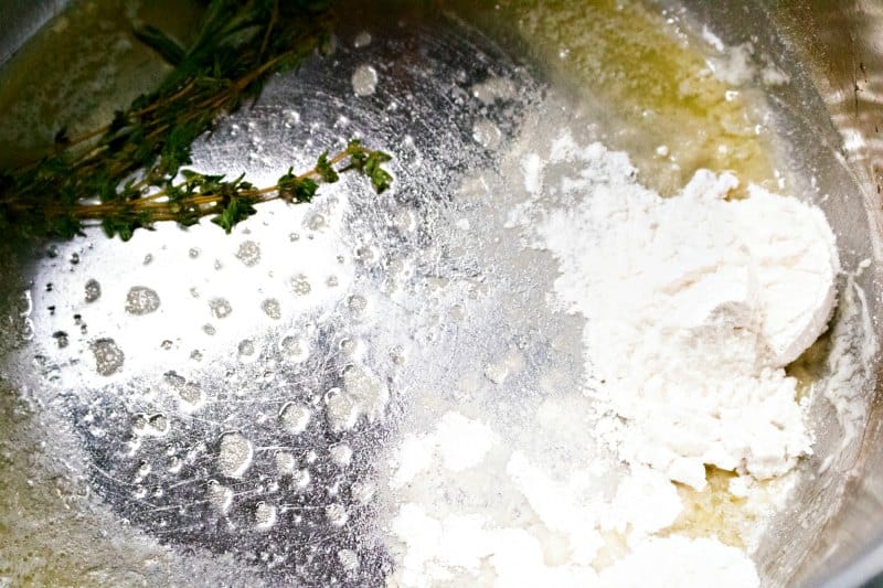 Keep stirring or whisking the butter and flour mixture and let it cook for 2-3 minutes. This will help get the flour flavor out and add a nice deep flavor to the stock. Just keep stirring so it does not burn. After cooking for a few minutes, add in the fresh herbs.