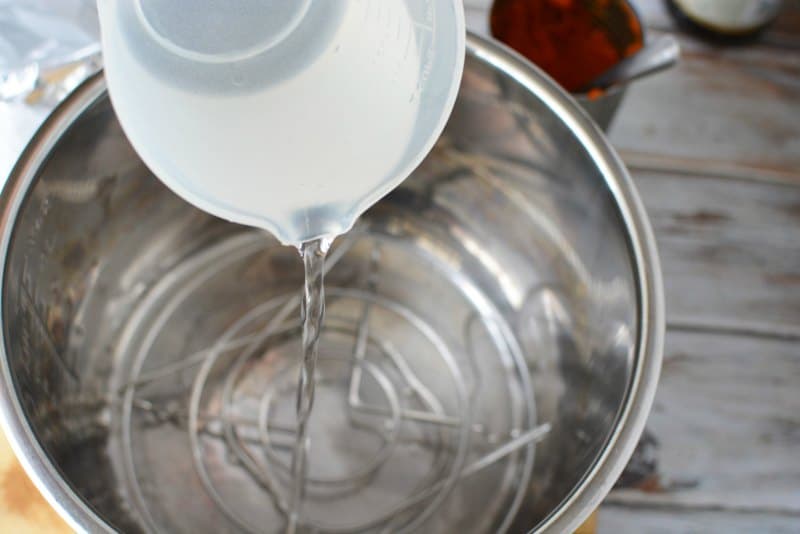 First, pour the water in the bottom of the Instant Pot. For more flavor you can use chicken or vegetable broth. You always need liquid when cooking in an Instant Pot so don’t skip this step.