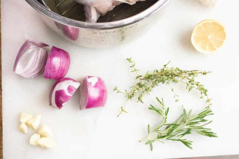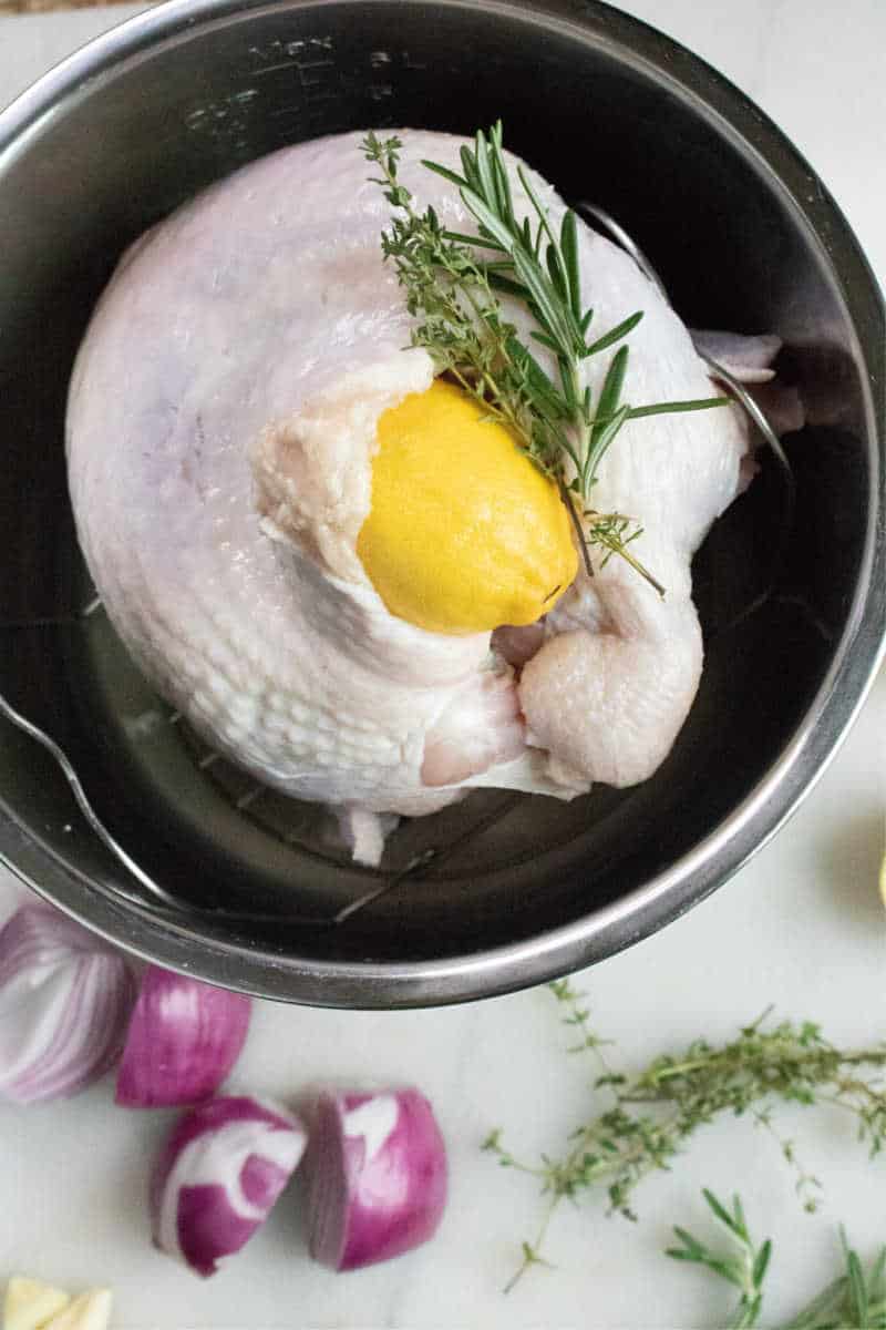 Put the trivet that comes with the Instant Pot in the bottom of the pot and set the turkey breast on the trivet in inner pot. Tuck the lemon into the top of the turkey breast along with a couple of sprigs of the thyme and rosemary.