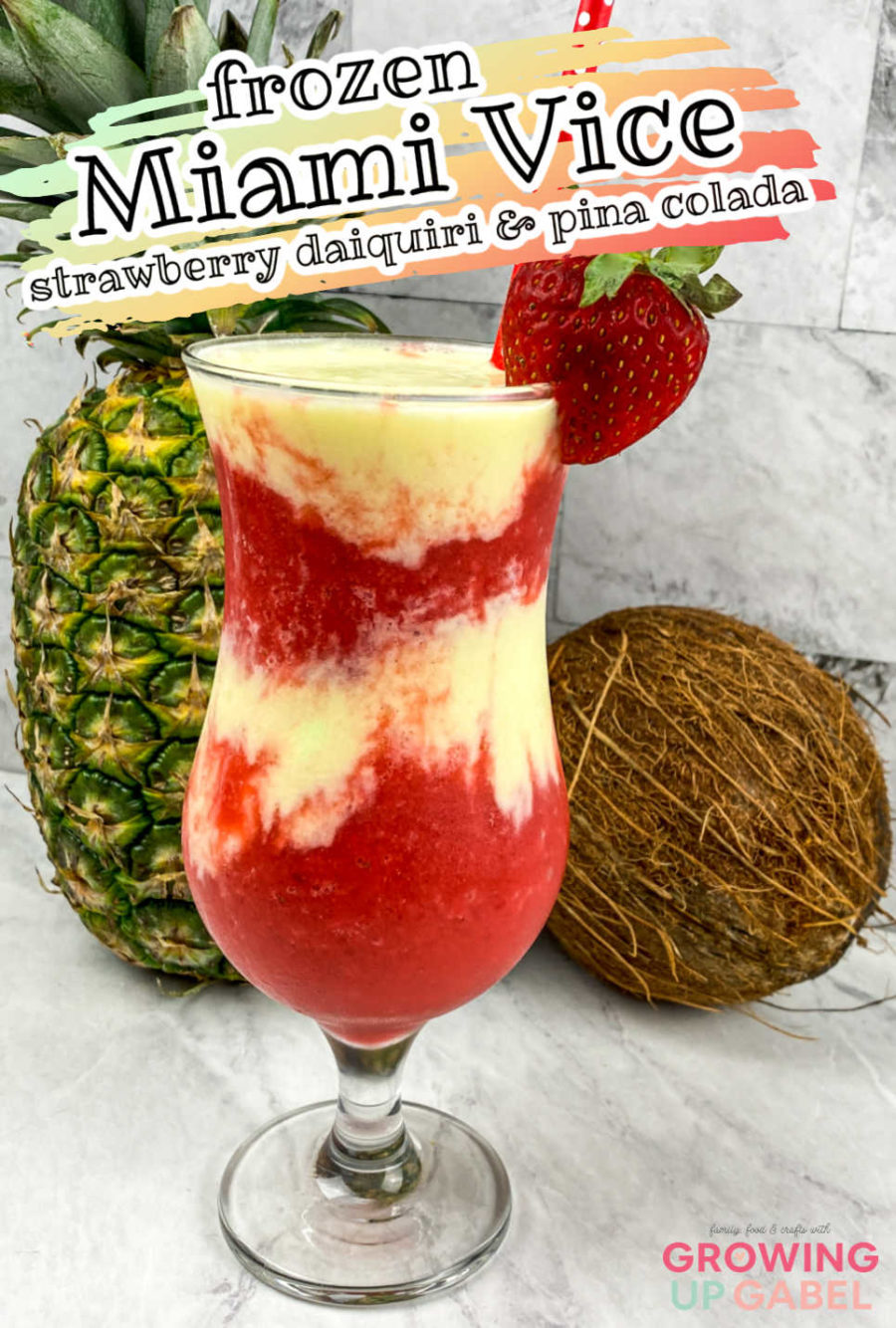 A Miami Vice drink is a frozen cocktail with layers of strawberry daiquiri and pina colada. It is the perfect summer drink!