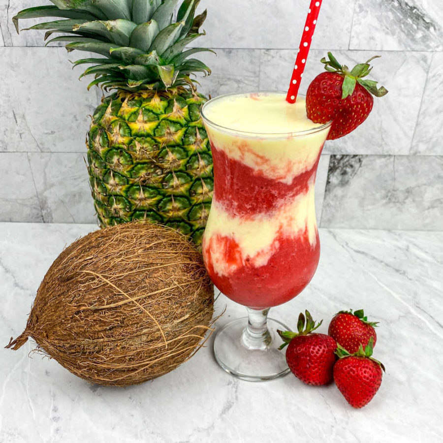 Rather than being a distinct recipe, the Miami Vice is a layered combination of two popular beachy cocktails: Frozen Strawberry Daiquiris and Frozen Pina Coladas.
