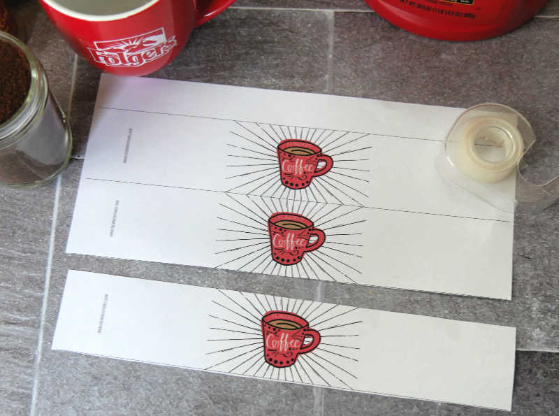 Wrap and then tape the label around the jar. Use a pen or sharpie to write the flavor of the coffee either on the label or on the top of the jar lid.