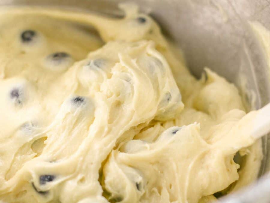 Toss the blueberries lightly in some flour. You just want to coat them. This will help them from sinking to the bottom of the muffin. Gently stir them in using a wooden spoon.