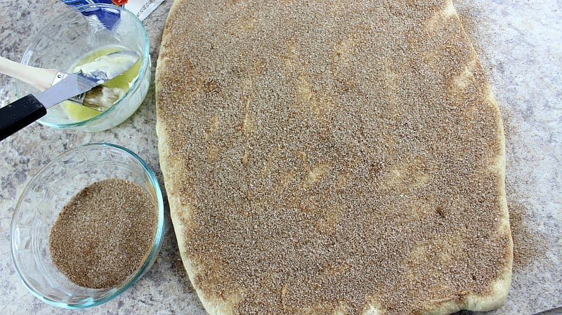 - Combine the brown sugar and cinnamon in a bowl and whisk to combine. Generously sprinkle the cinnamon sugar on top of the buttered dough.