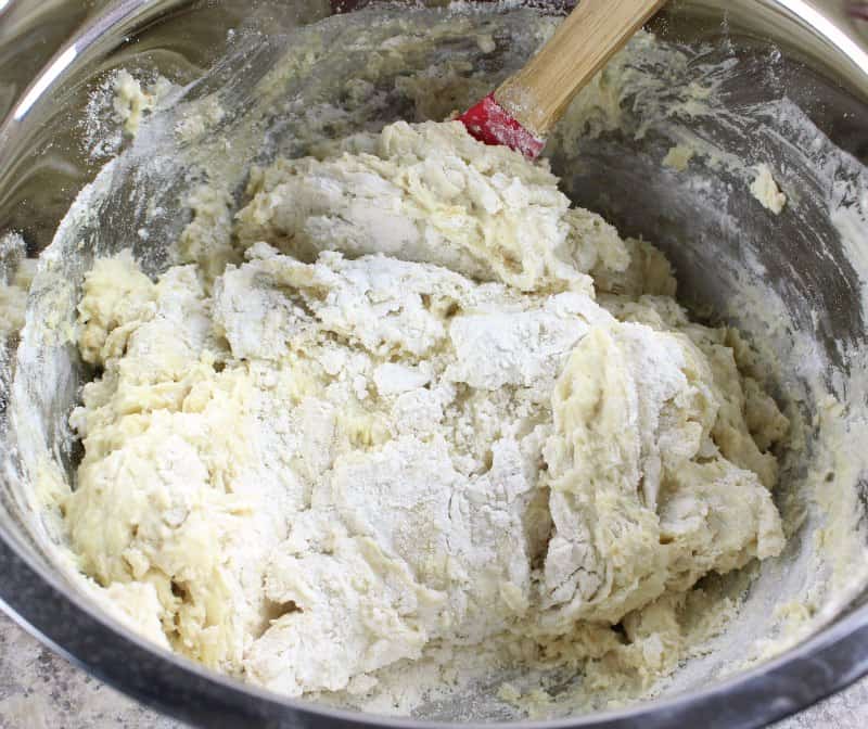 Add 3/4 cup flour to the mixture and knead by hand for one minute in the bowl. You can also make the dough in a stand mixer with a dough hook. Don’t try to do this with a paddle. It won’t work. You’ll only need to knead it until the dough forms and then a few seconds more.