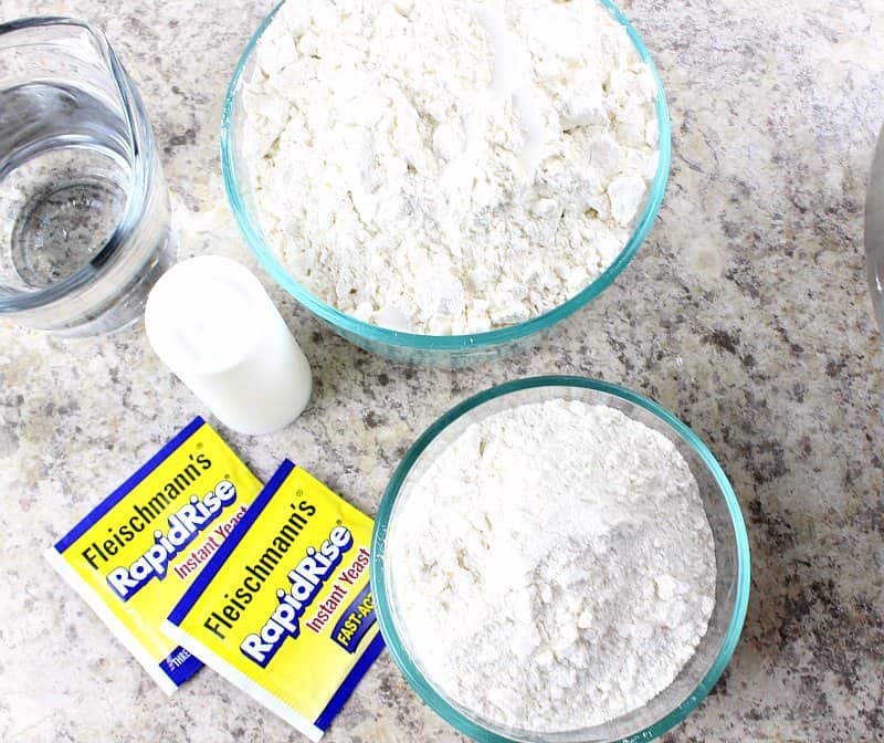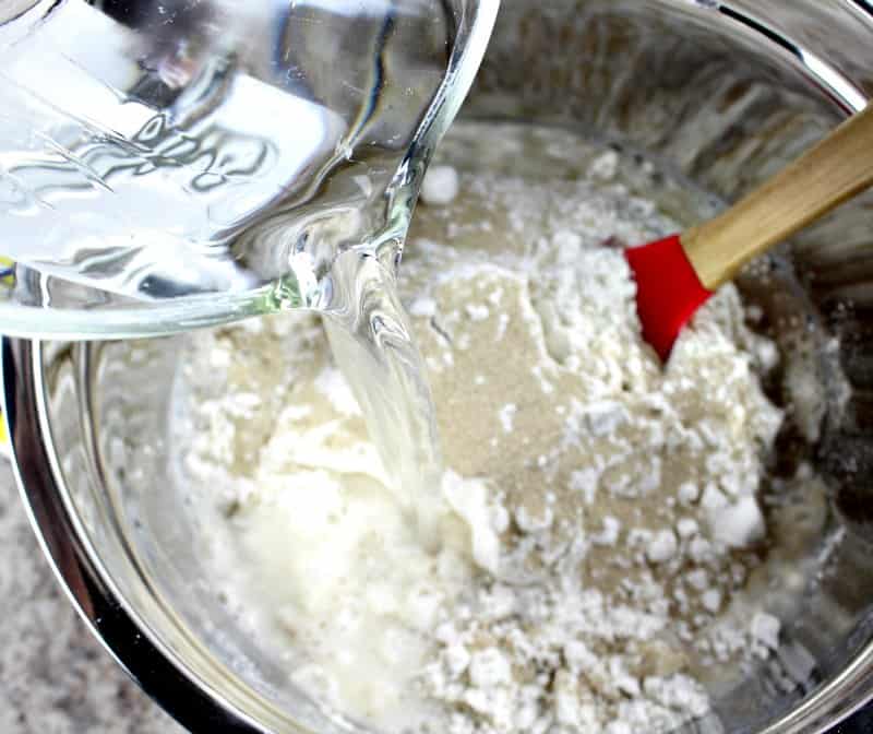 - In a large mixing bowl, add 4 cups flour, cake mix, yeast and salt. Whisk lightly to combine.