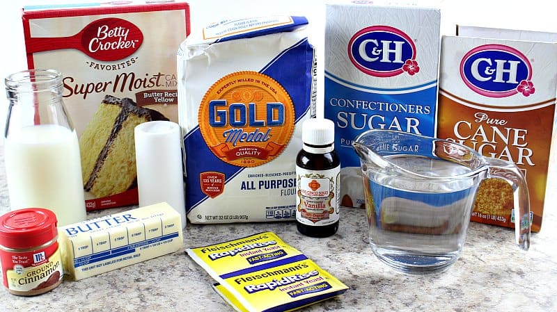 These cinnamon rolls need pretty much the same basic ingredients as most cinnamon roll recipes like flour, yeast, butter (or any fat), brown sugar and cinnamon. But you’ll also use a cake mix to make the rolls super soft and add a cakey flavor.