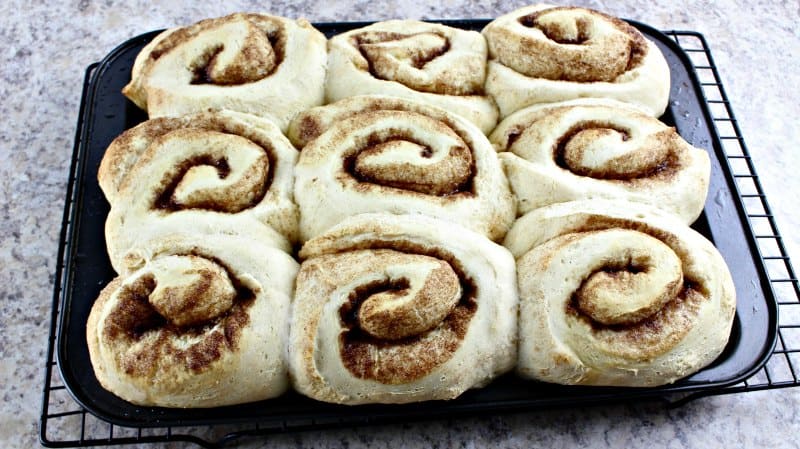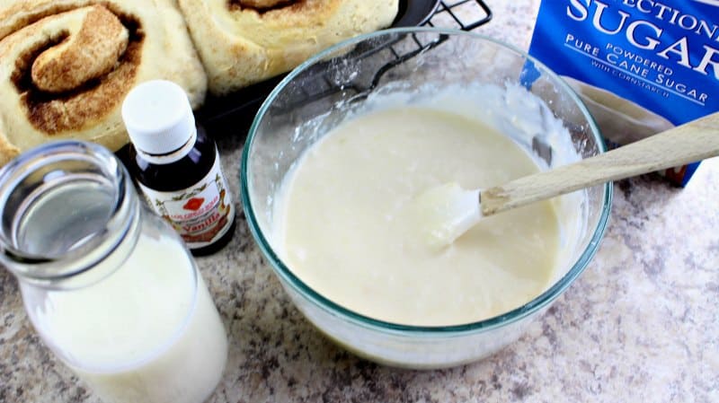 - Bake for 15 minutes or until the rolls are a light golden brown in color. Remove from oven and allow to cool in the pan on a wire rack for 5 minutes before drizzling the vanilla glaze on top.